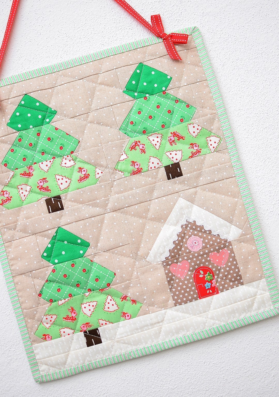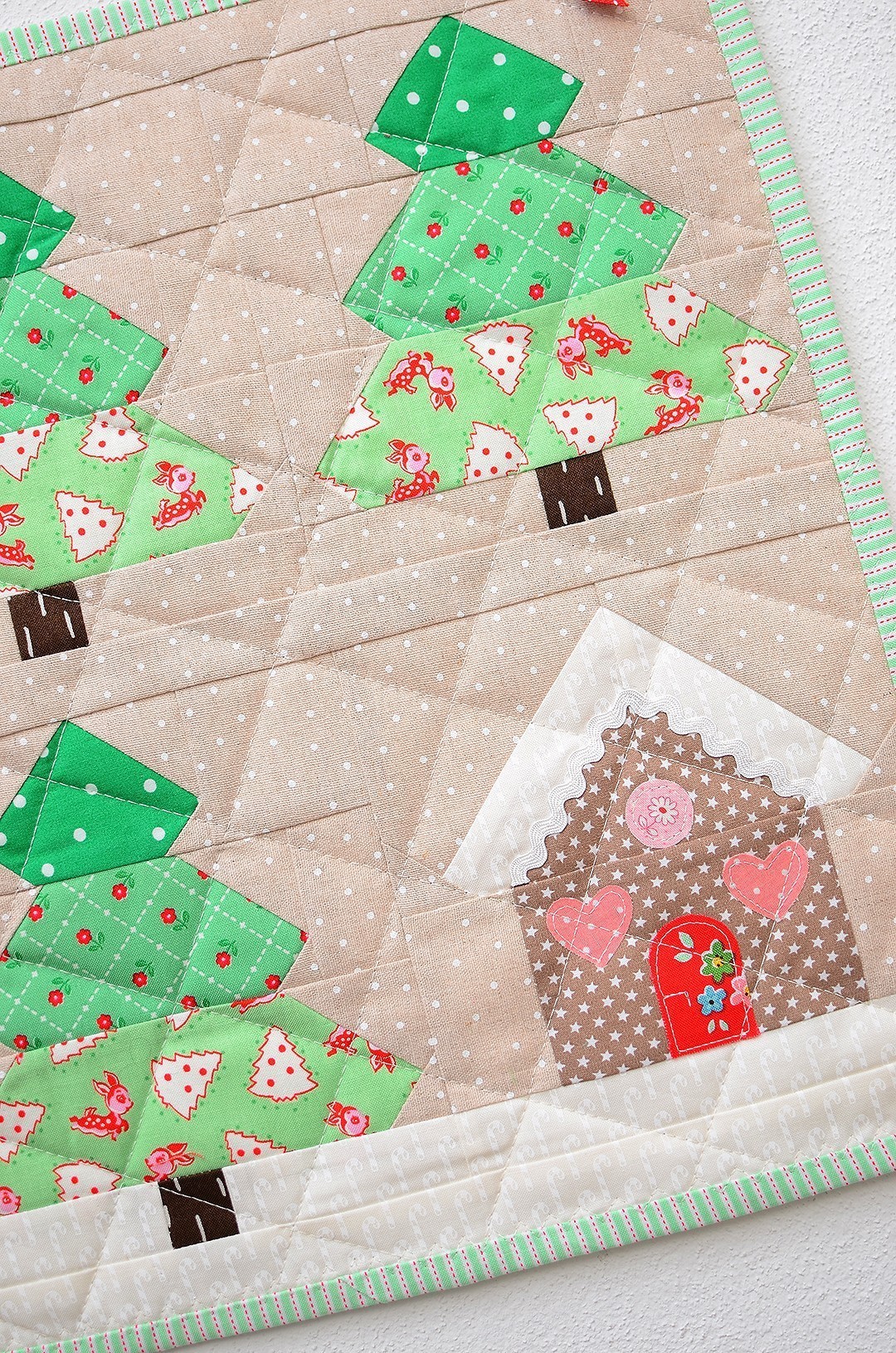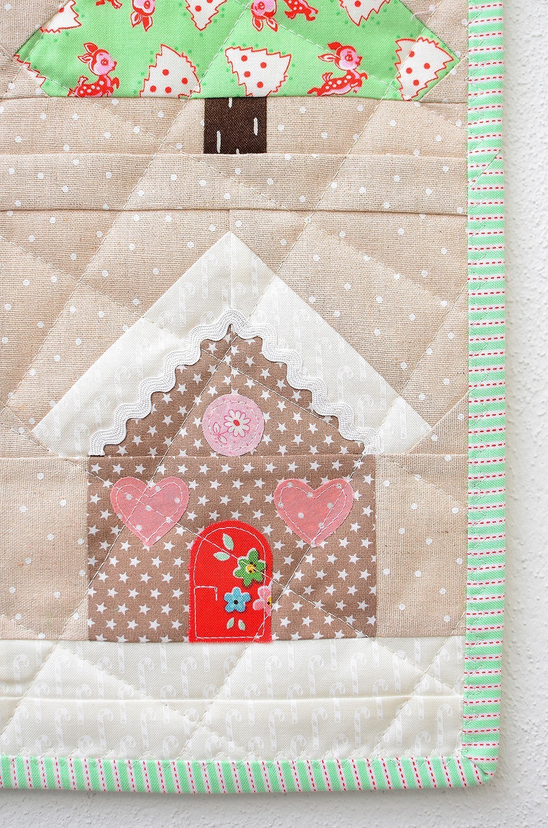 Gingerbread House Christmas quilt patternAnleitungs-Erweiterung Nummer zwei ist das Gingerbread Forest Mini Quilt Tutorial. Die Weihnachstzeitbringt immer die schönsten Kindheitserinnerungen zurück – dieser Mini Quilt erinnert mich an Weihnachtsmärchen, denen wir gelauscht haben, eingekuschelt auf der Couch, ausgestattet mit Keksen und Punsch…