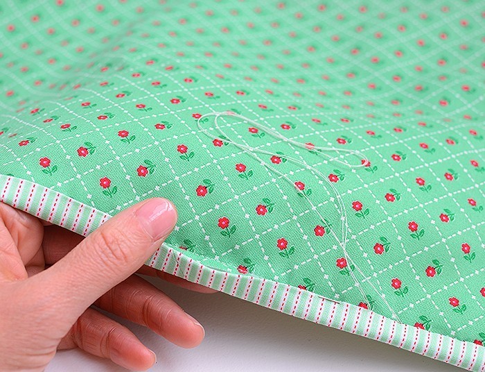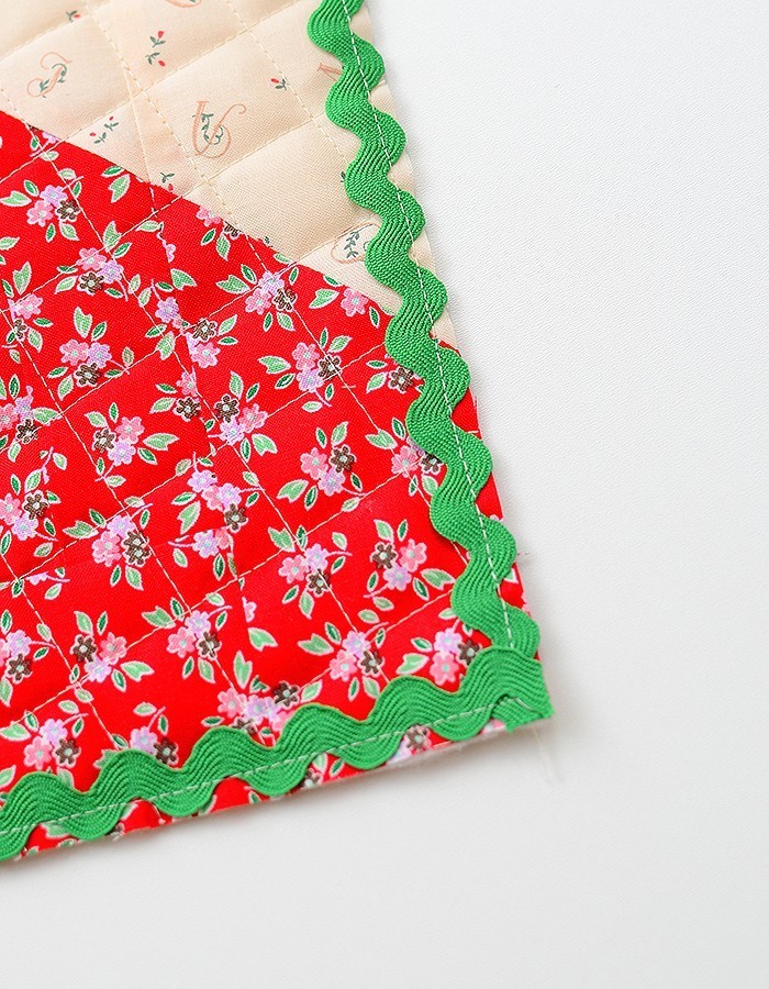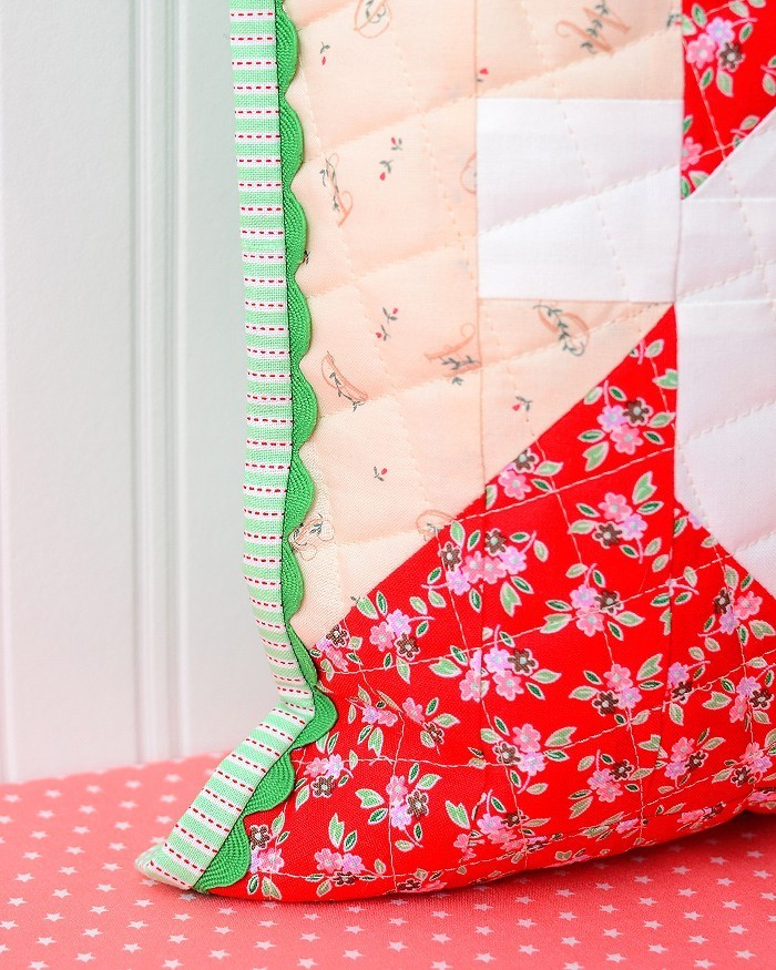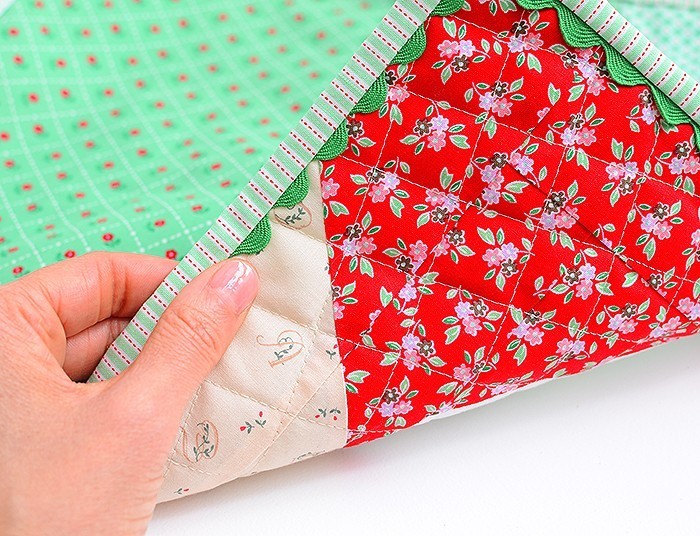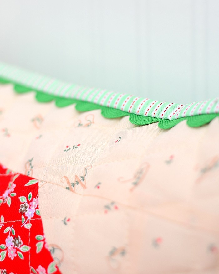 Download the free pattern here (scroll all the way down for more images and to see how I attached the rick rack ribbon to the binding):