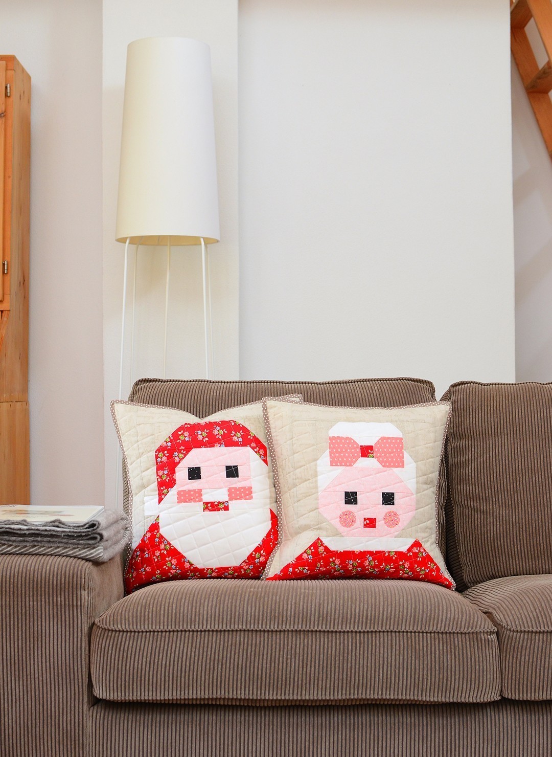 [Dieser Beitrag enthält Werbung] Pattern add-on no. 3 is the Santa & Mrs. Claus Quilted Christmas Pillow Tutorial – these two are just so cute on my couch, patiently waiting for Christmas to come! I’ve used a 12″ block for both of the pillows. They measure 16″ square and have an easy to make envelope closure. They’re not only great for adding a festive touch to your living room, but will also make a wonderful gift for your loved ones!