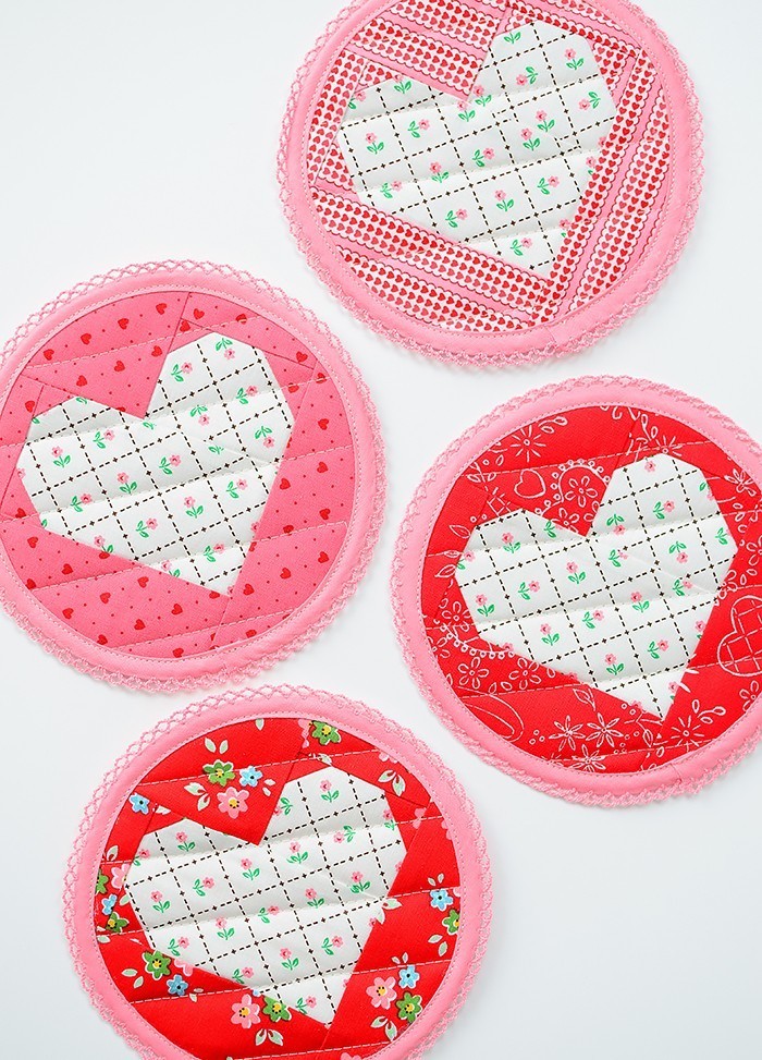 Bald ist Valentinstag! Vielleicht bist du ja noch auf der Suche nach einem schnellen Geschenk, oder willst deine/deinen Liebste/n mit einem romantischen Frühstück überraschen? ‘Tiny Hearts’ war mein erster Valentinstag Quilt und ich liebe ihn immer noch, denn die kleinen Blöcke sind superschnell und einfach genäht, und für alle möglichen kleinen Projekte geeignet, wie diese niedlichen Herz-Untersetzer! Ich hatte bereits einige Anfragen für die zusätzlichen Maße und stelle sie euch heute wie versprochen zur Verfügung!
